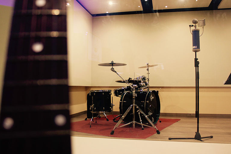 La sala de grabación. Como el resto del estudio, está construida para tener una respuesta plana en todas las frecuencias, de este modo, se puede grabar exactamente lo que se está reproduciendo. Las dimensiones de la sala permiten poder grabar a un grupo entero a la vez, pudiendo así captar la esencia de la banda si la producción lo requiere.
